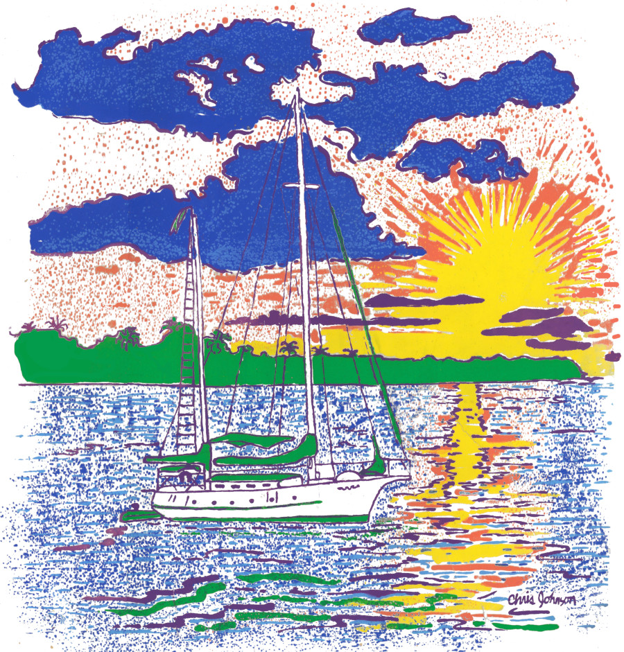 Ketch Sailboat at Sunset – From one of the most exotic places around the world, this scene from Roatan, Honduras. The sunset from a ketch rig sailboat is a magnificent display of beauty on the Caribbean Gulf Coast ocean.