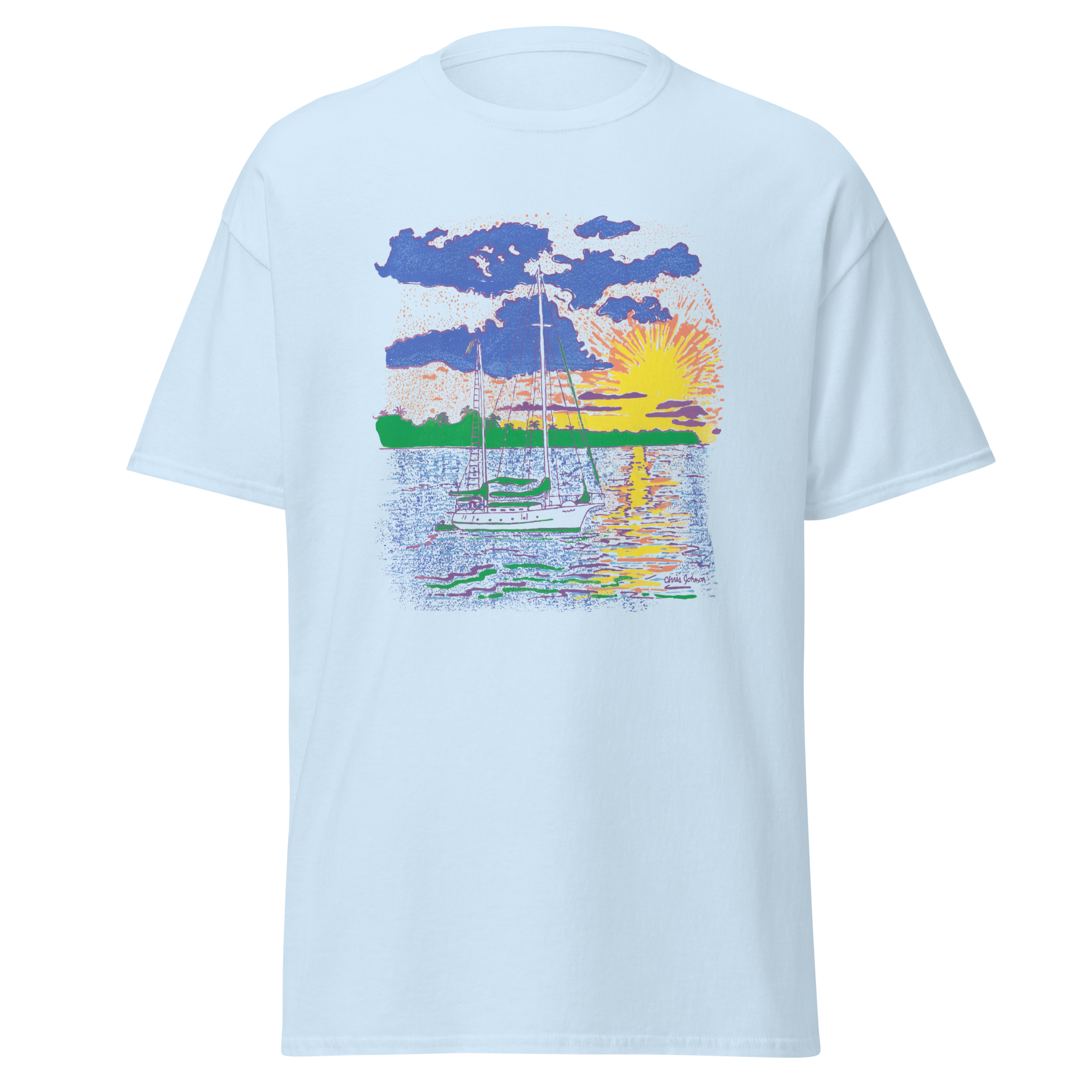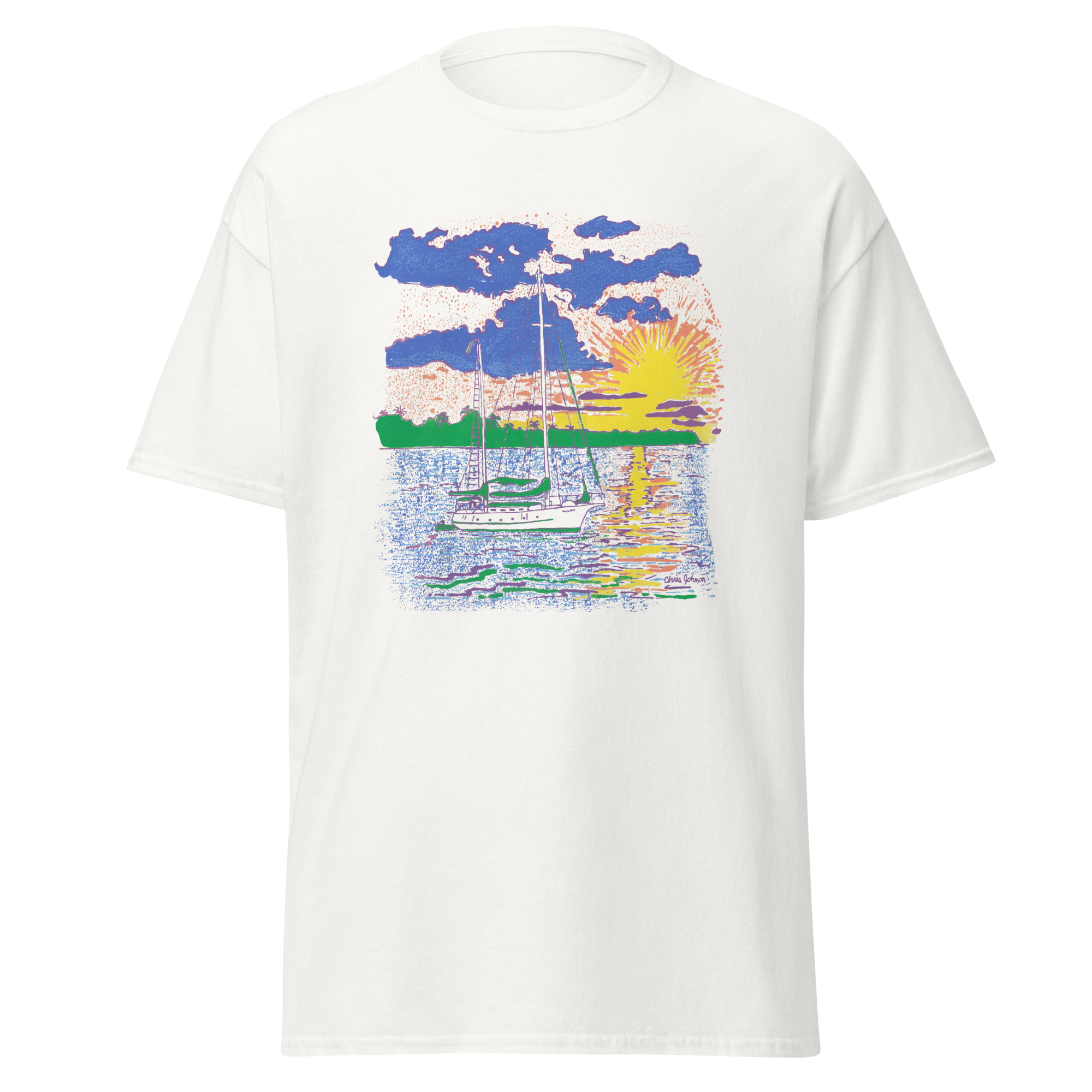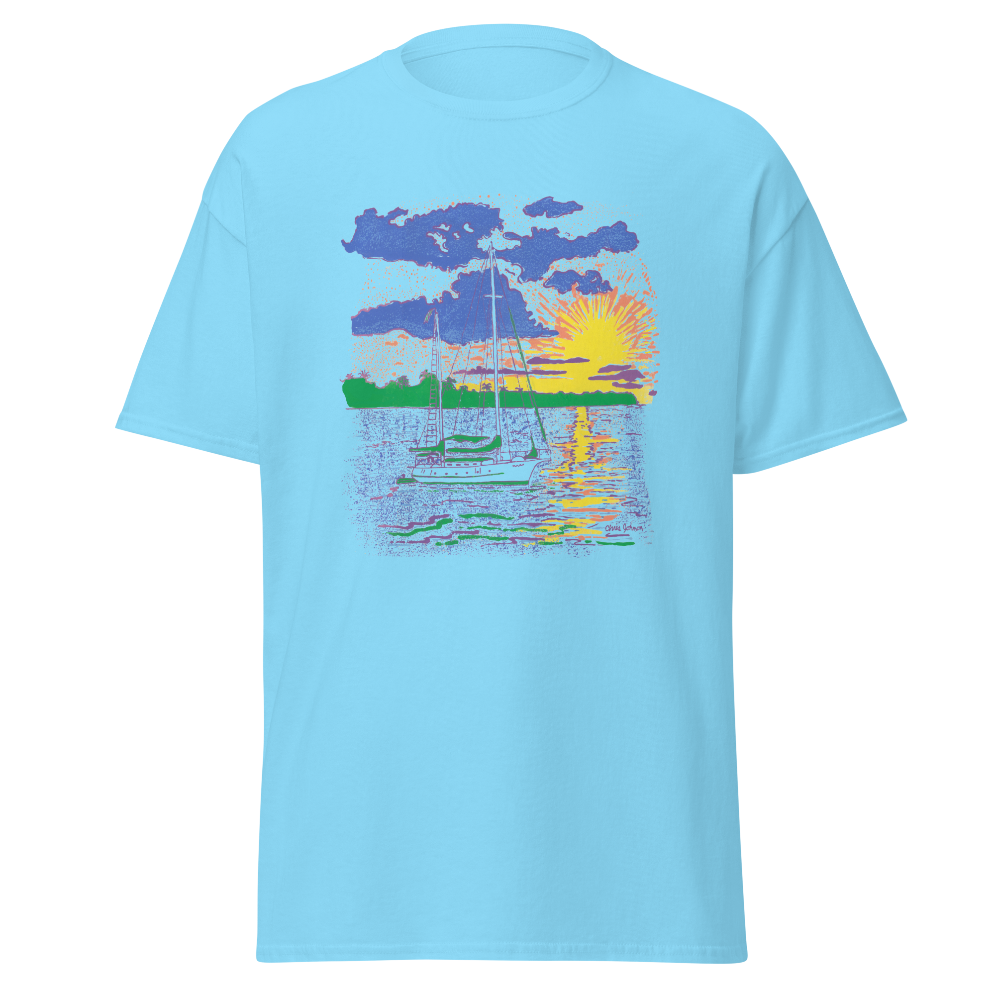 Sailboat at Sunset – From one of the most exotic places around the world. A ketch rigged sailboat is cruising in the calm waters. The sunset is a magnificent display of beauty on the Caribbean Gulf Coast ocean. This t-shirt design was inspired near the island of Roatan, Honduras.