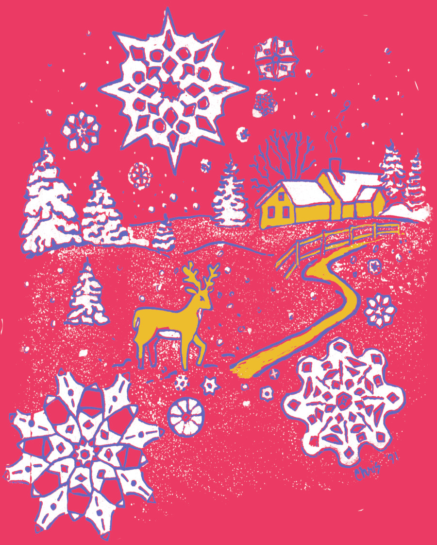 Snowflakes fall in a winter wonderland as a reindeer stands tall in the foreground. The farm house is in the distance just down the country lane. We know it is warm and cozy there. Christmas snow is in the air. Christmas shirt you will wear every year in the season.